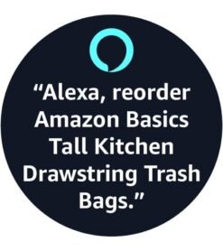 Alexa voice shopping enabled: to place your next order. just say. Alexa. reorder Amazon Basics Tall Kitchen Drawstring Trash Bags.