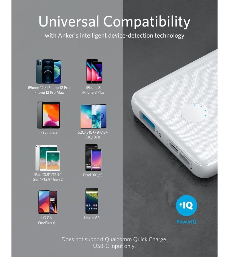 <b>Slim Size. Big Power:</b> A slim and light 10.000mAh portable chargers on the market. Provides 2.25 charges for iPhone 12. 1.6 charges for Galaxy S20 and 1.2 charges for iPad mini 5.
