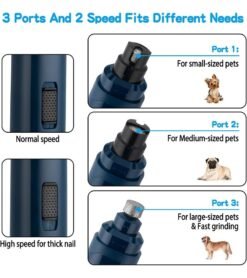 Advanced 2-Speed Switch & 3 Grinding Ports: The trimmer features an adjustable. low-high speed design powerful enough support heavy grinding. And with 3 ports to match small. medium. or large pets. simply choose the appropriate port and speed depending on your pet’s size and nail hardness.