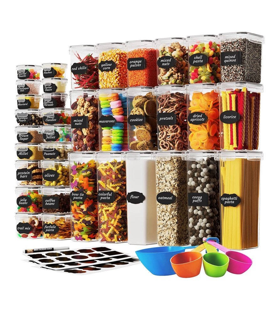 Superior Bundle – Your complete bundle comes with 36 BPA-free premium containers for food. measuring spoon set. a chalkboard marker & bonus reusable chalkboard labels. all in all a complete pantry organizer set.Best Bang for your Buck – We provide a higher total storing capacity unlike most others on Amazon. Includes 6 extra large containers (2.8 liters). 6 large containers (2.0 liters). 6 medium containers (1.4 liter). 6 small containers (0.8 liters). 6 extra small containers (0.52L). 6 mini containers (140ml)Versatile Containers – Upgrade your food storage game by storing anything – flour. sugar. rice. grain. cereals. nuts. beans. snacks. pasta spaghetti. coffee and tea. Not only this. you can also hold other pantry storage items including liquids.Stackable Design – These airtight food storage containers with lids are modular and will stack to minimize space consumption. Easy for storing inside the refrigerator. freezer or cupboard which enables you to get the kitchen organized and frees up space in the pantry.Maximum Airtight Protection – The 4 sided-locking lids with silicone seal ensure that no air or water enters. keeping your favorite snacks super fresh and dry. These canisters are designed to cater to all your kitchen storage needs.
