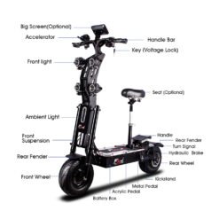 | — with Big Screen — with 4pcs Front light + Acrylic Pedal Colorful LED Light + Turn Signal + Rear light — With folddable handle — Aluminum Alloy frame — Max Load : about 120kgs — Net Weight: about 55kgs (not included seat; with set add about 2.5kgs) — With Hydraulic suspensions. — With Doubal pedals |