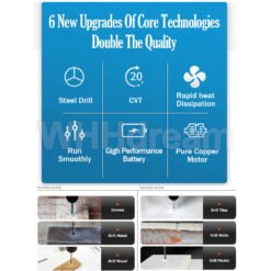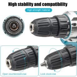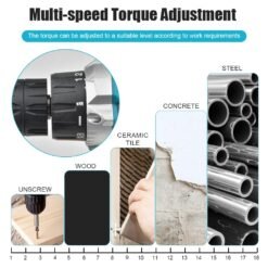 High efficiency motor, delivers up to 12N.m of torque and 0-450r/min of speed- Drill chuck for quick and simple bit replacementUsing the Forward/Reverse Switch, speed torque adjustmentThe forward/reverse switch may be set to three positions:forward, reverse and lock. Due to a lockout mechanism, the forward/ reverse switch can only be adjusted when the trigger is not pressed. Always allow the motor to come to a complete stop before using the forward/reverse switch.- With in LED working light, provides illumination in dark spaces as you work- Ergonomic & comfortable handle provides ideal balance and tool control- 2 stages settings flat drilling and turning screws.