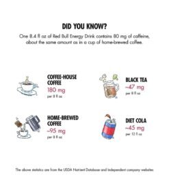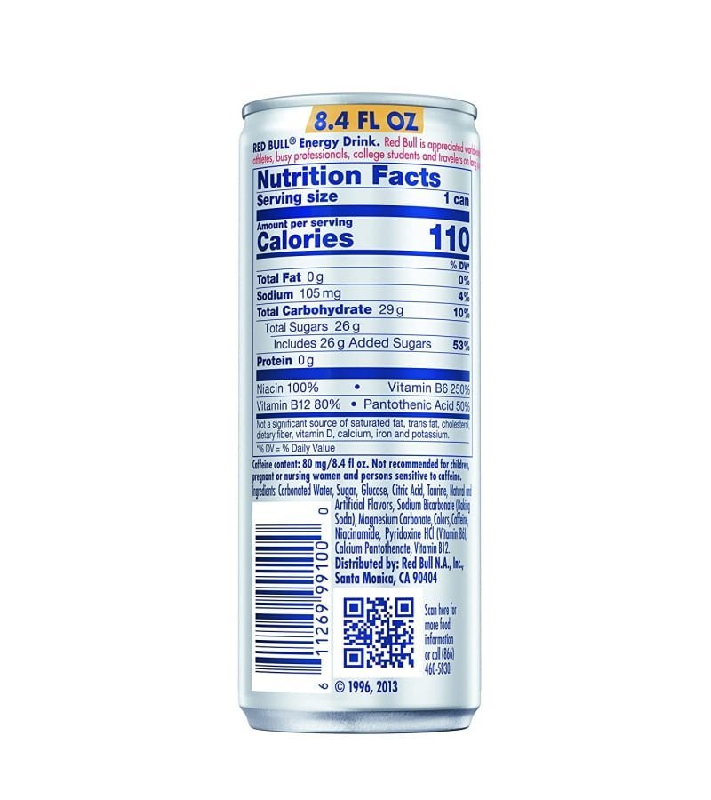 Red Bull Energy Drinks formula contains high quality ingredients: Caffeine. Taurine. B group Vitamins. Sugars. Alpine water