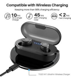 Stereo Sound Quality TOZO T10 Earbuds’ 8mm large size speaker driver (the drive area is 1.77 times than the normal drive area) delivers powerful bass( lowest 16Hz). mellow midrange. and clear treble(up to 20kHz). Reproducing your music vividly.Bluetooth 5.3 Features with the advanced Bluetooth 5.3 technology. TOZO T10 Earbuds support HSP HFP A2DP AVRCP. which provides instant pairing and stable transmission without interruptions.One Step Ppairing Simply take 2 headsets out from the charging case. and they will connect each other automatically and then only one step easily enter mobile phone Bluetooth setting to pair the earbuds.IPX8 Waterproof Earbuds and charging case inner Nano-coating makes it possible to waterproof for 1 meters deep for 30 minutes. Waterproof and sweatproof latest technology can effectively prevent from the damage of the splash by sweat and raindrops.Charge on the Go Playtime lasts for over 10 hours from single charge and total 45 hours with charging case. Enjoy?fast?charging. to?fully?charge?the?rechargeable?case?only?1.5 hours via?fast charge USB-C cable?or?less?than?2?hours?via?wireless?charger. Providing convenient charging way with no strings attached.